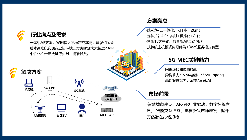 “5G MEC+AR互动+AI广告”方案可广泛应用于机场、景区、影院、商场、营业厅等场景,可采用广告付费模式及用户付费模式。随着智慧城市的建设,在AR/VR行业驱动下,数字标牌的发展,智能交互增益,新零售、景区商场等市场规模爆发,“5G MEC+AR互动+AI广告”超千亿潜在市场规模将加快拉开帷幕。